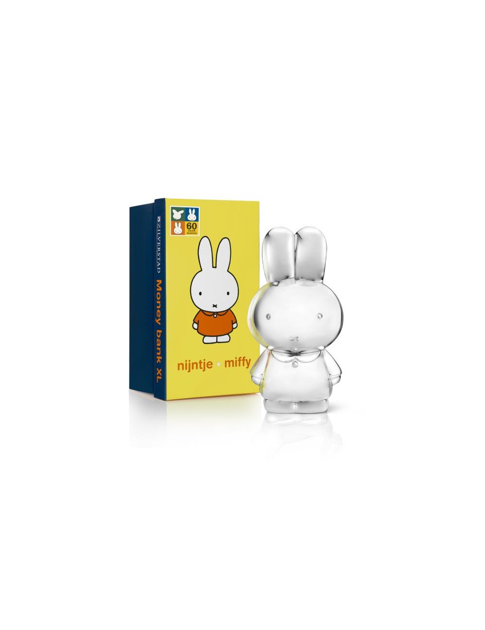 Spaarpot Nijntje XL ook wel Nijntje Pluis of Miffy genoemd geschreven en getekend door Dick Bruna. Deze extra grote Nijntje spaarpot is uitgegeven omdat Nijntje 60 jaar oud is geworden. Deze spaarpot Nijntje is al jaren één van onze populaire spaarpotten. De Nijntje spaarpot is aan de onderkant voorzien van een afneembaar rond dekseltje om de spaarpot makkelijk te kunnen legen. De spaarpot is in zilverkleur dus poetsen is niet nodig.